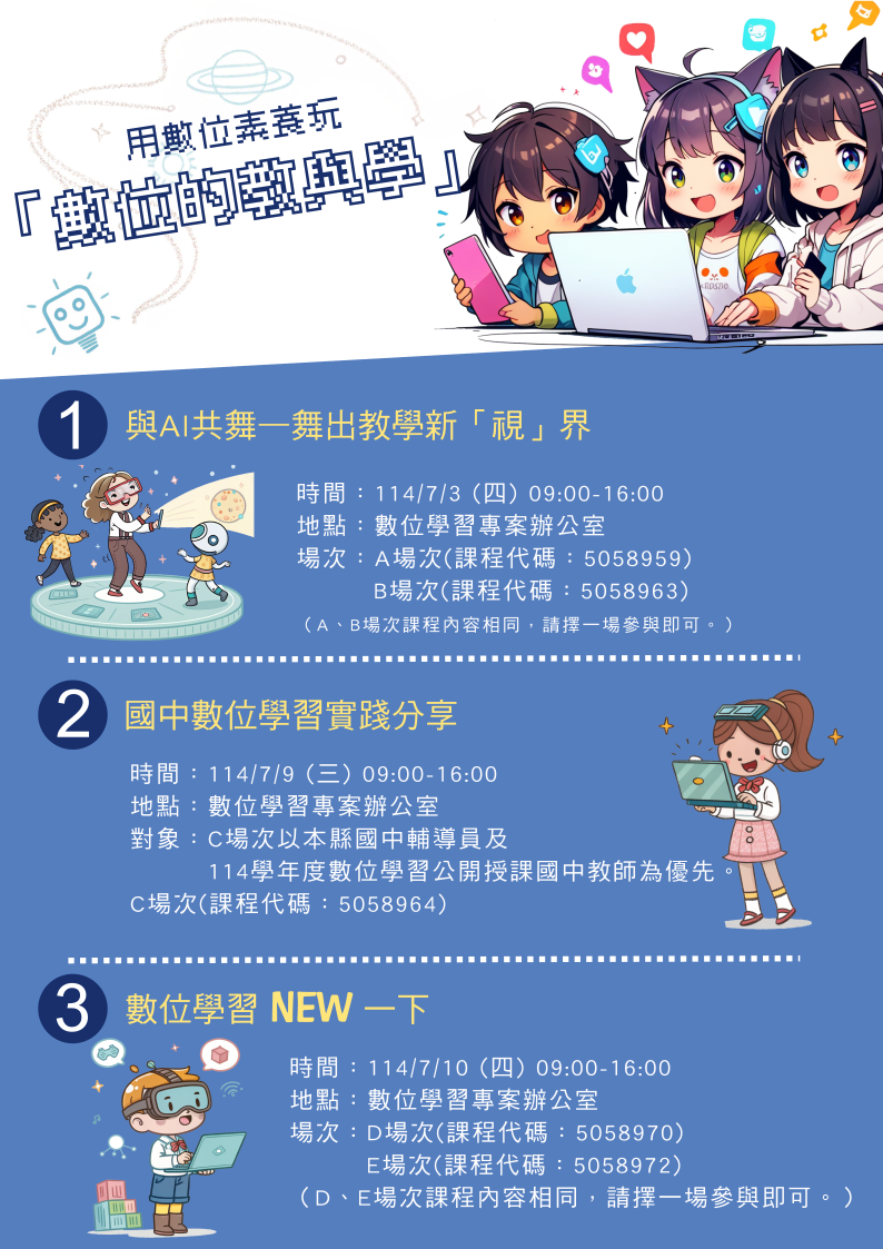 | E場次 | 114年7月10日(四) 9:00~16 :00 | 數位學習專案辦公室 | 5058972 |