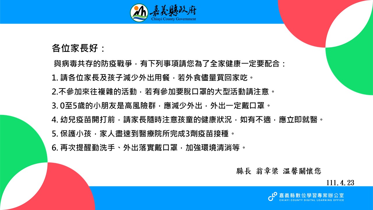縣長溫馨關懷家庭學校防疫小叮嚀