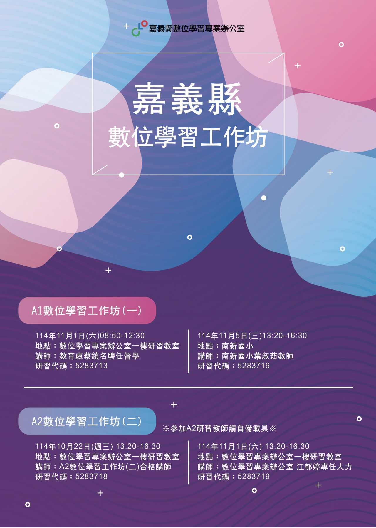 | 第一場次 | 114年11月 1日 (六) 8:50~12:30 | 數位學習專案辦公室一樓研習教室 | 5283713 |